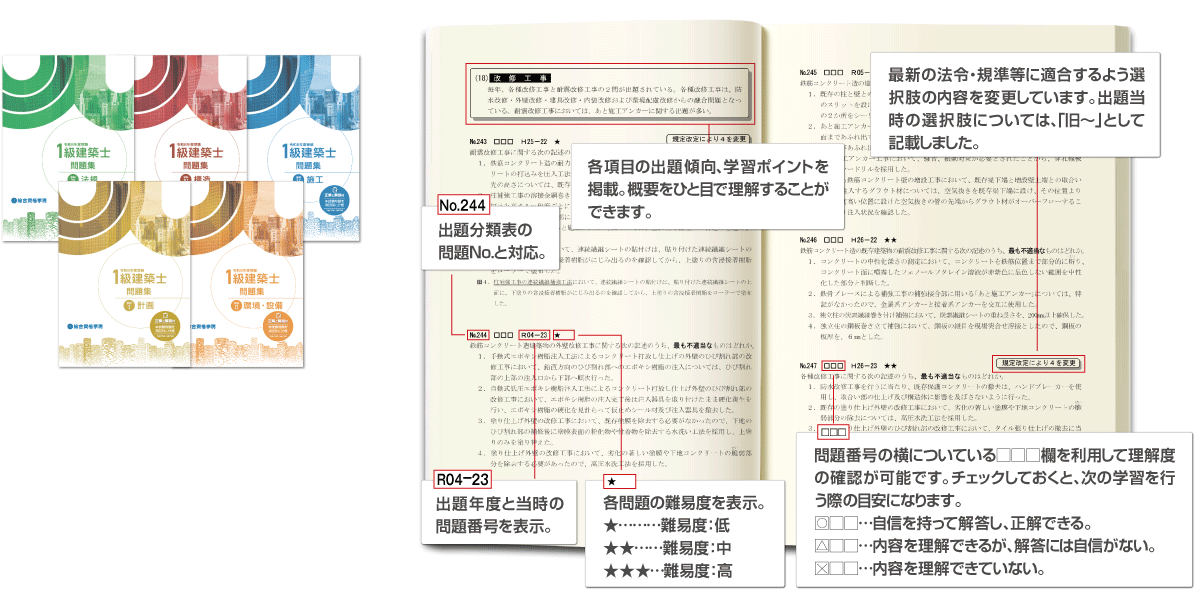 過去の出題実績から、本試験への出題が予想される建築物や、話題性のある建築物等を厳選して掲載した作品集。カラー写真や図を豊富に使用しているので、実際の建築物の具体的なイメージをつかむことができ、理解の向上につながります。