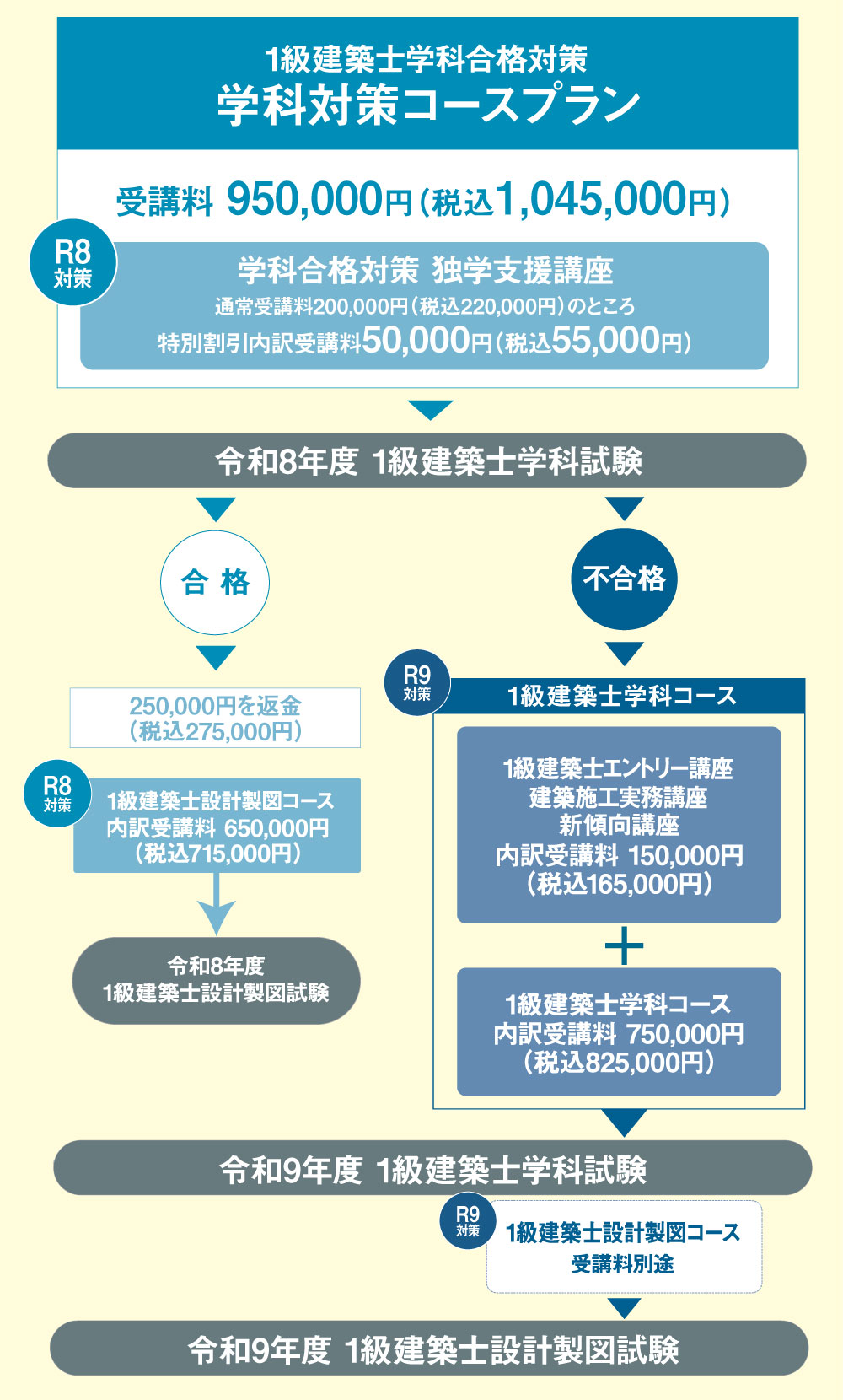 - 上記プランをお申込の方が、令和8年度学科試験に合格された場合、受講料より差額250,000円(税込275,000円)を返金いたします。