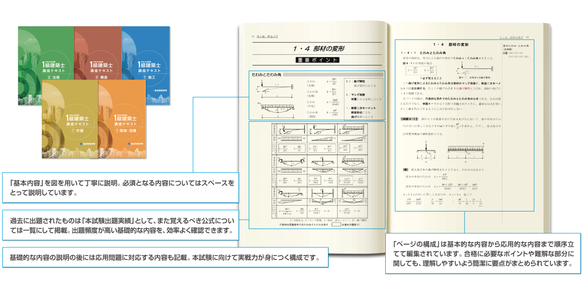 1級建築士の学習を進めるうえで基本となる事項を、イラストや表などを使ってわかりやすく解説しています。学習の土台を作ることを目的とした教材です。