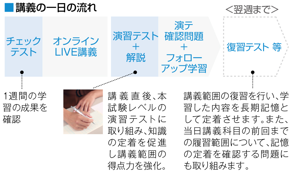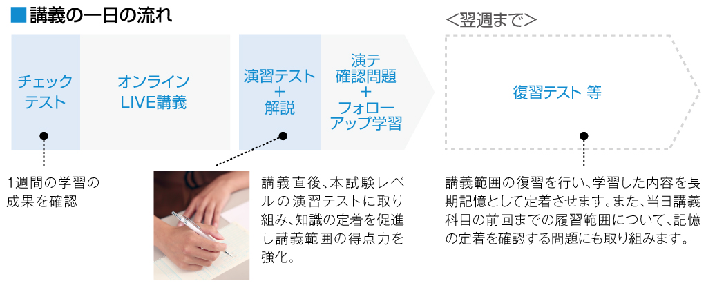 オンラインLIVE講義は、カリキュラムに沿ったライブ配信受講を通じて、集中力とモチベーションを維持したまま、試験まで学習を継続することができます。