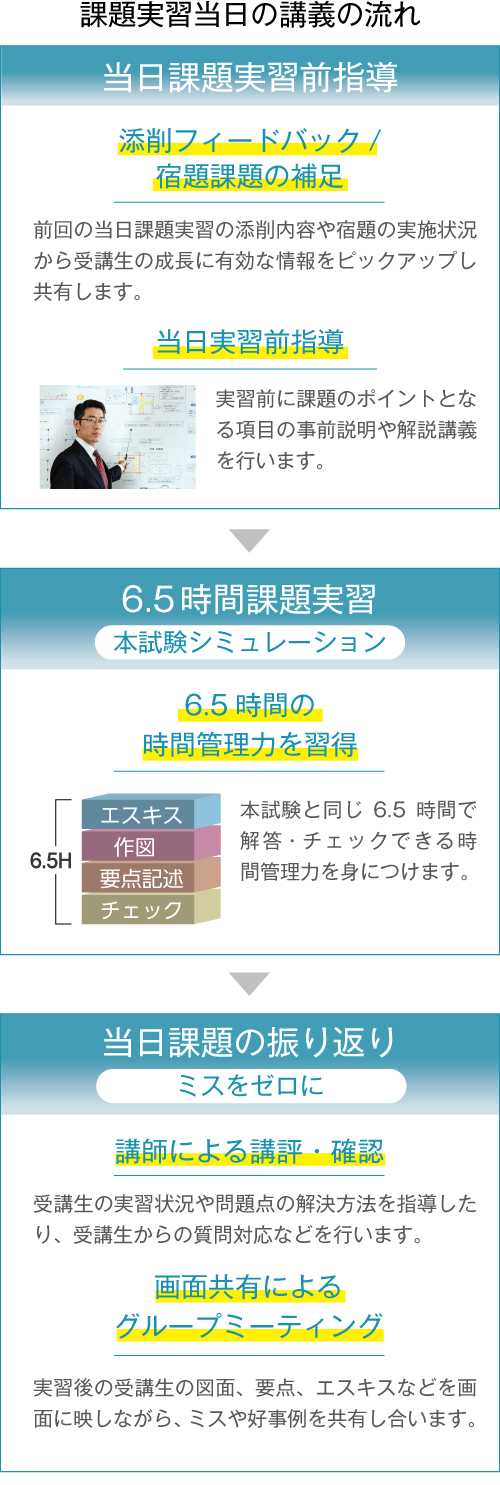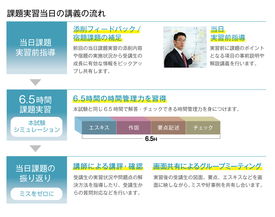 本コースの課題実習講義日は、「6.5時間の実習」と「実習前後の学習フォロー」が基本。課題実習は、本試験と同時間で、かつ本試験を想定した課題を用いて、限られた時間内に解答・セルフチェックできる時間管理力を養成します。 また、講義前には当日の実習前指導や前回課題のフィードバックなどを実施。講義後には当日課題の振り返りを行います。この実習前後のオンライン学習フォローで、課題実習の学習効果を高めます。