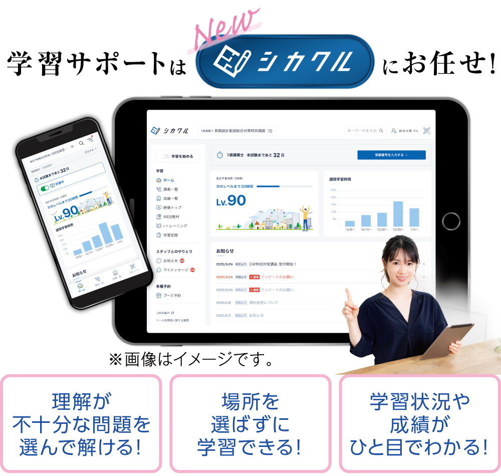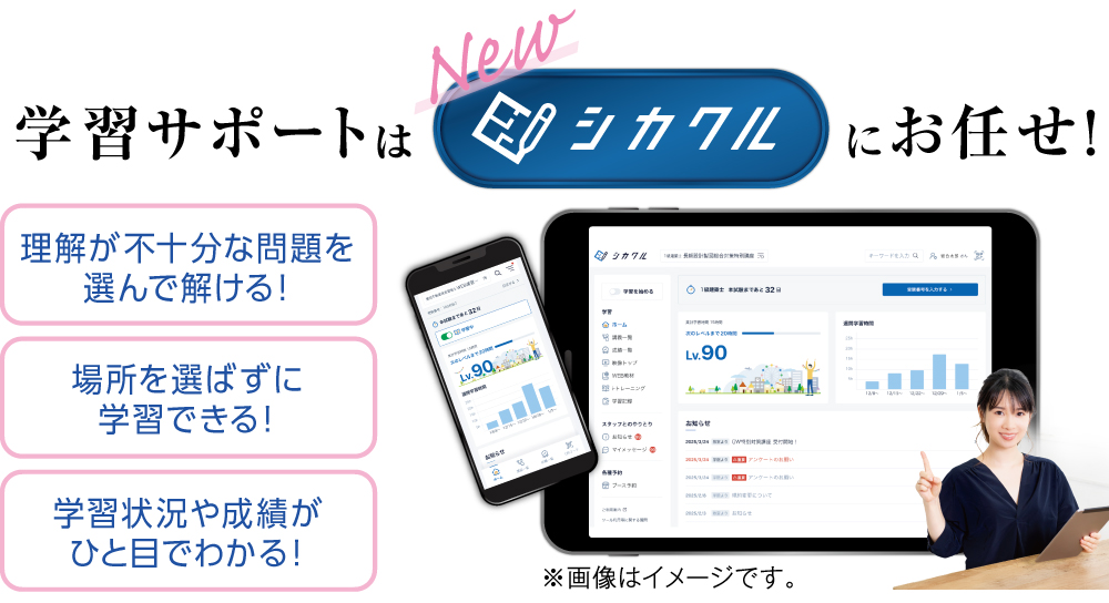 シカクルは、長年の資格指導における分析と数多くの受講生の要望をもとに、当学院が独自に開発したデジタル学習サポートシステムです。