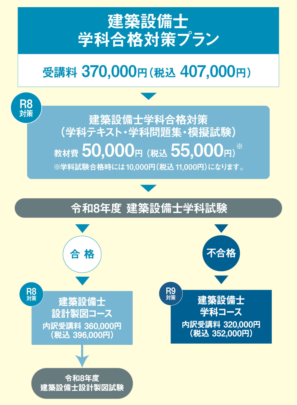 - 本プランは、学科試験の結果をもとに、合格時には令和8年度受験 建築設備士設計製図コース、不合格時には令和9年度受験 建築設備士学科コースを受講していただくプランです。追加受講料等はありません。