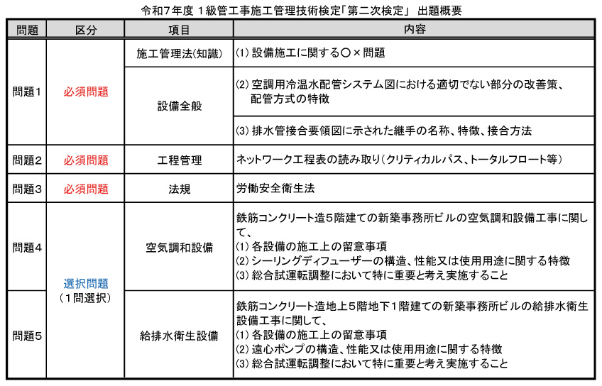 令和7年度 1級管工事施工管理技術検定試験「第二次検定」は、必須問題3問、選択問題2問の計5問から4問を解答する形式で実施されました。問題1[設問1]のみ○×形式で、その他の問題はすべて記述式の解答でした。全体の難度は、例年と同程度かやや難しかったと考えられます。