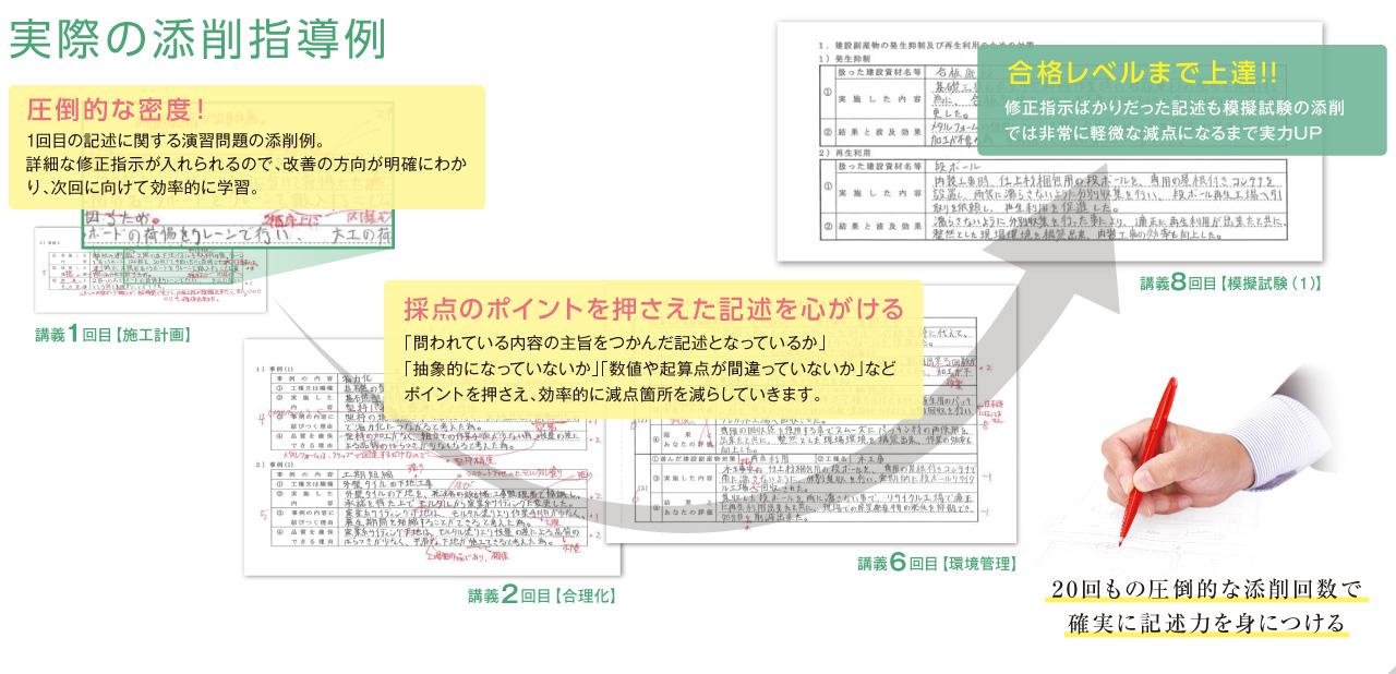 毎回の丁寧な添削により、施工に関する専門的な記述能力はもちろん、文章表現においても、印象の良い、隙のない記述ができるよう、徹底的に実力を養成します。