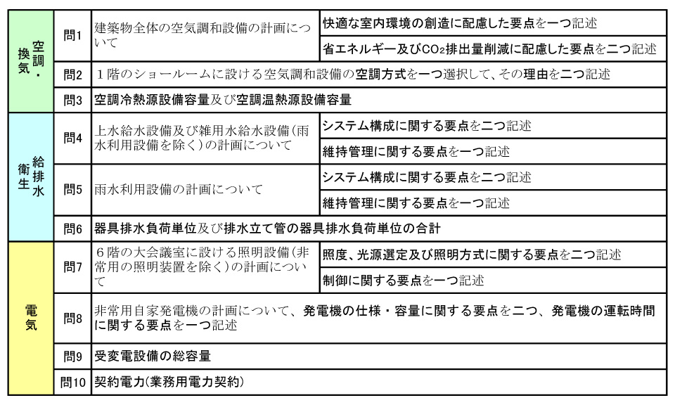 必須問題10問、選択問題各3問(空調・換気、給排水衛生、電気から1つ選択)