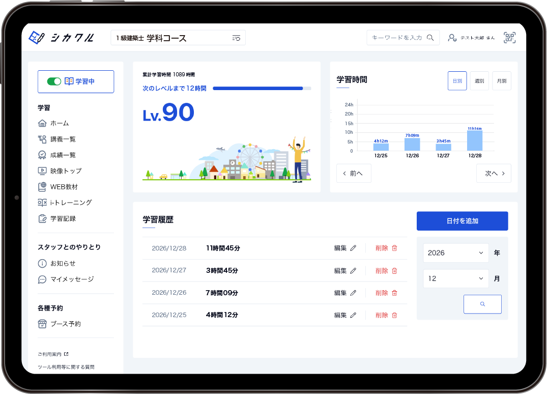 シカクルとは、デジタル端末を通じた総合資格学院の新しい学習サポートシステムです。 長年の資格指導における分析と数多くの受講生の要望をもとに、 当学院が独自に開発。効果的・効率的に学力UPをサポートします。