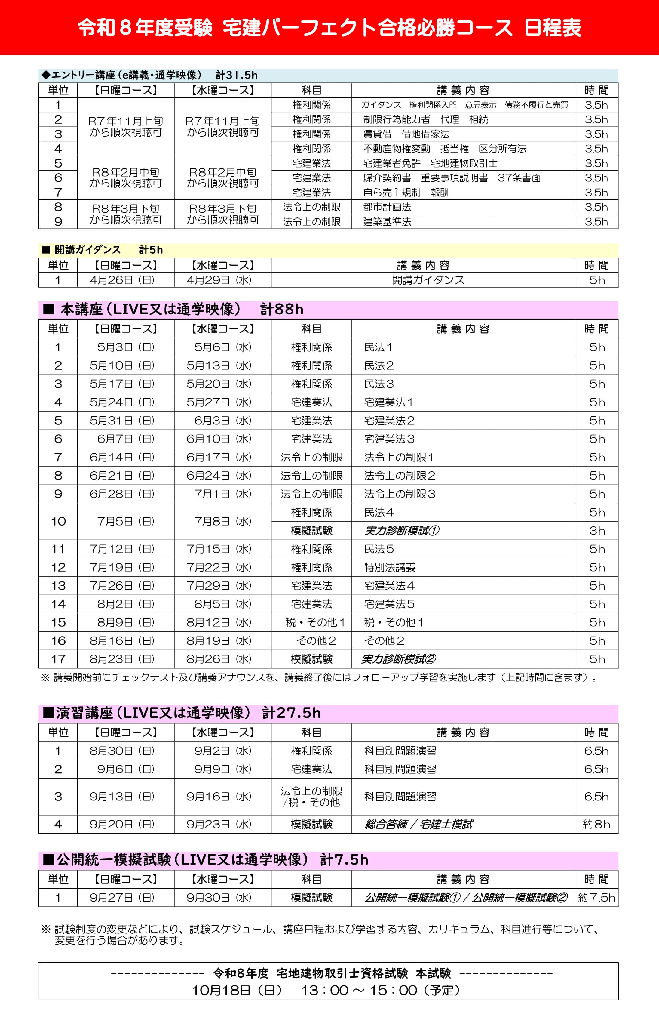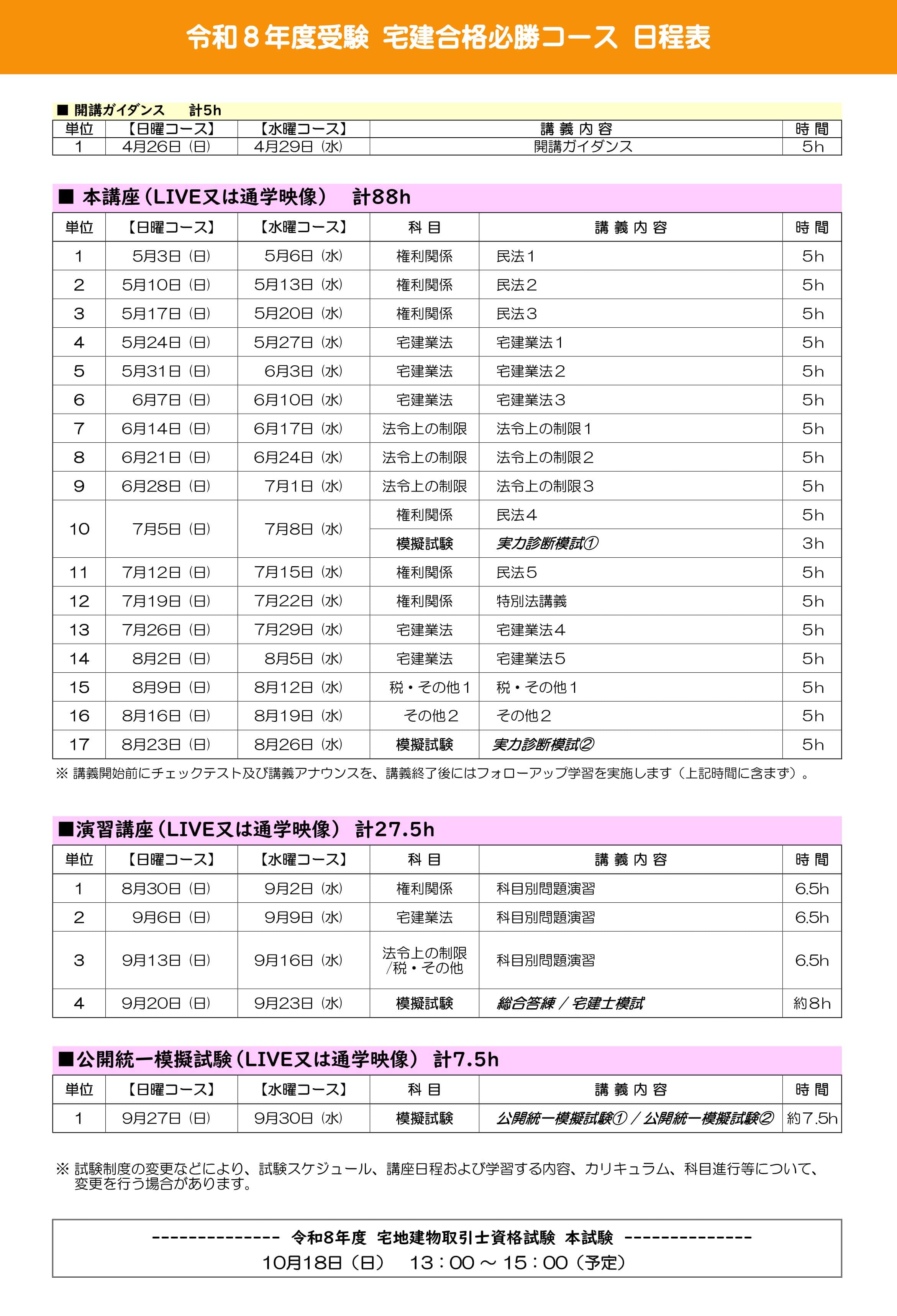 - 令和8年度 宅建パーフェクト合格必勝コース及び宅建合格必勝コースの受講生で、出席率9割以上・宿題提出率9割以上・公開統一模試9割以上をクリアし、宅建本試験を受験したにも関わらず不合格だった場合には、令和9年に限り無料にて同講座を受講することができます。